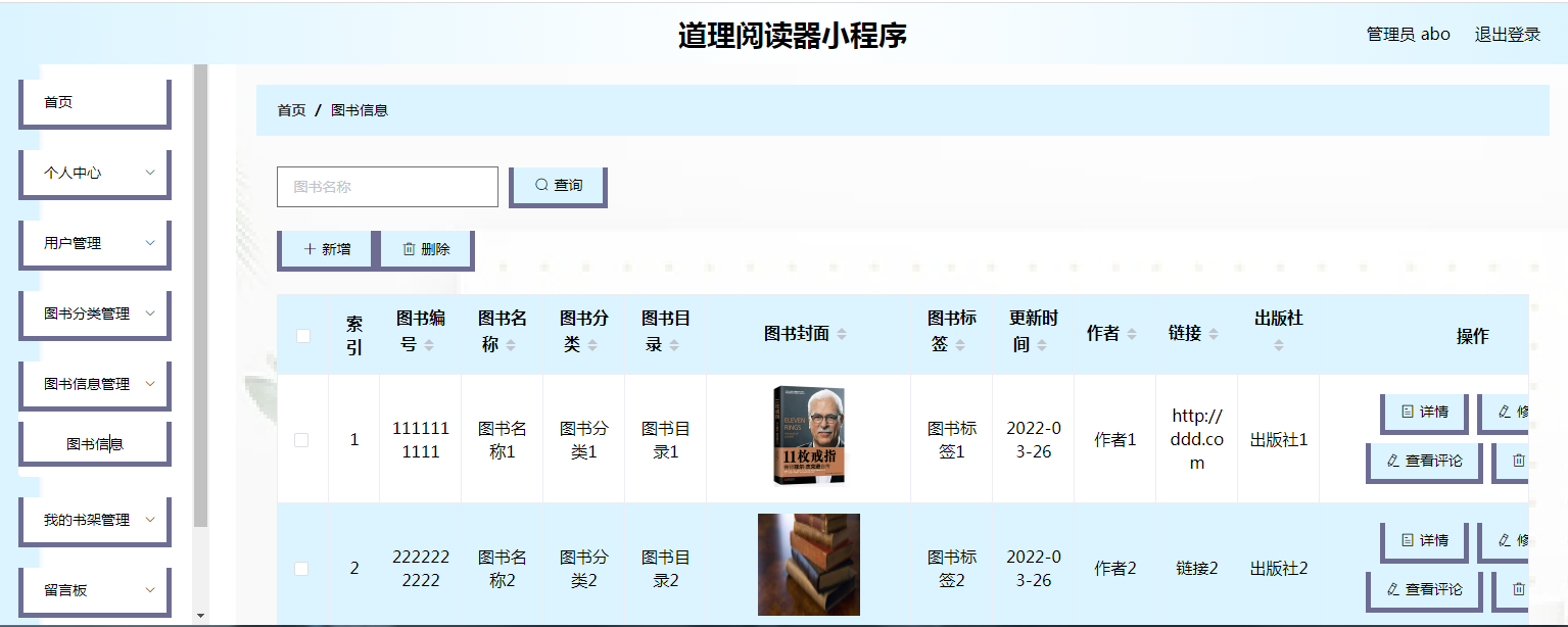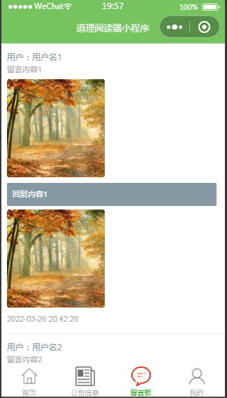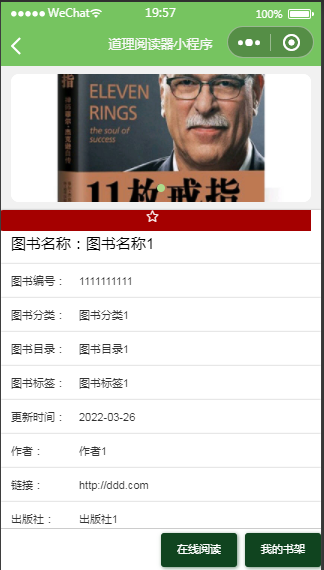 用户可以通过小程序端进行登录操作,并查看图书信息、公告信息、留言板等。在图书详情页面,用户可以进行在线阅读或将图书加入个人书架。在"我的"页面,用户可以查看自己的图书信息、书架信息、收藏管理以及留言板信息等。