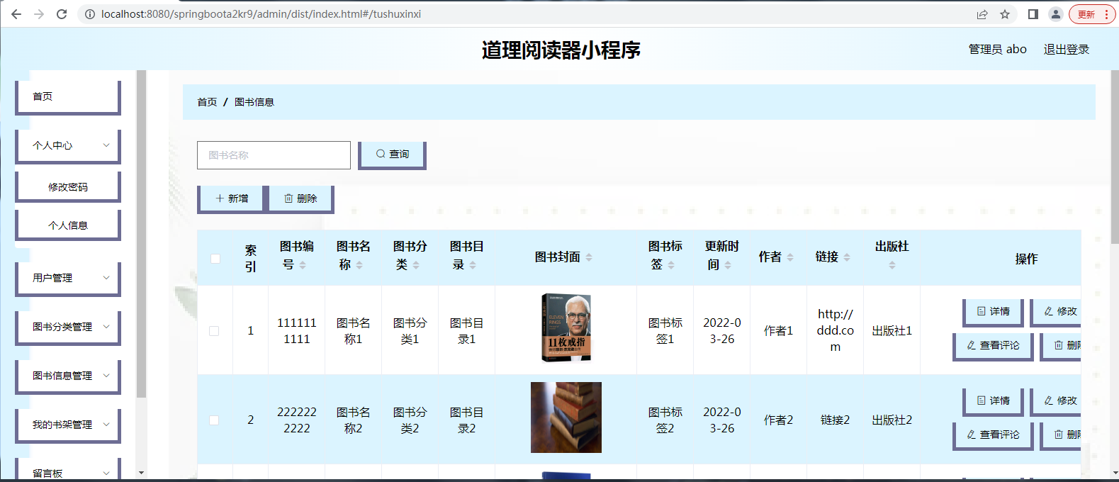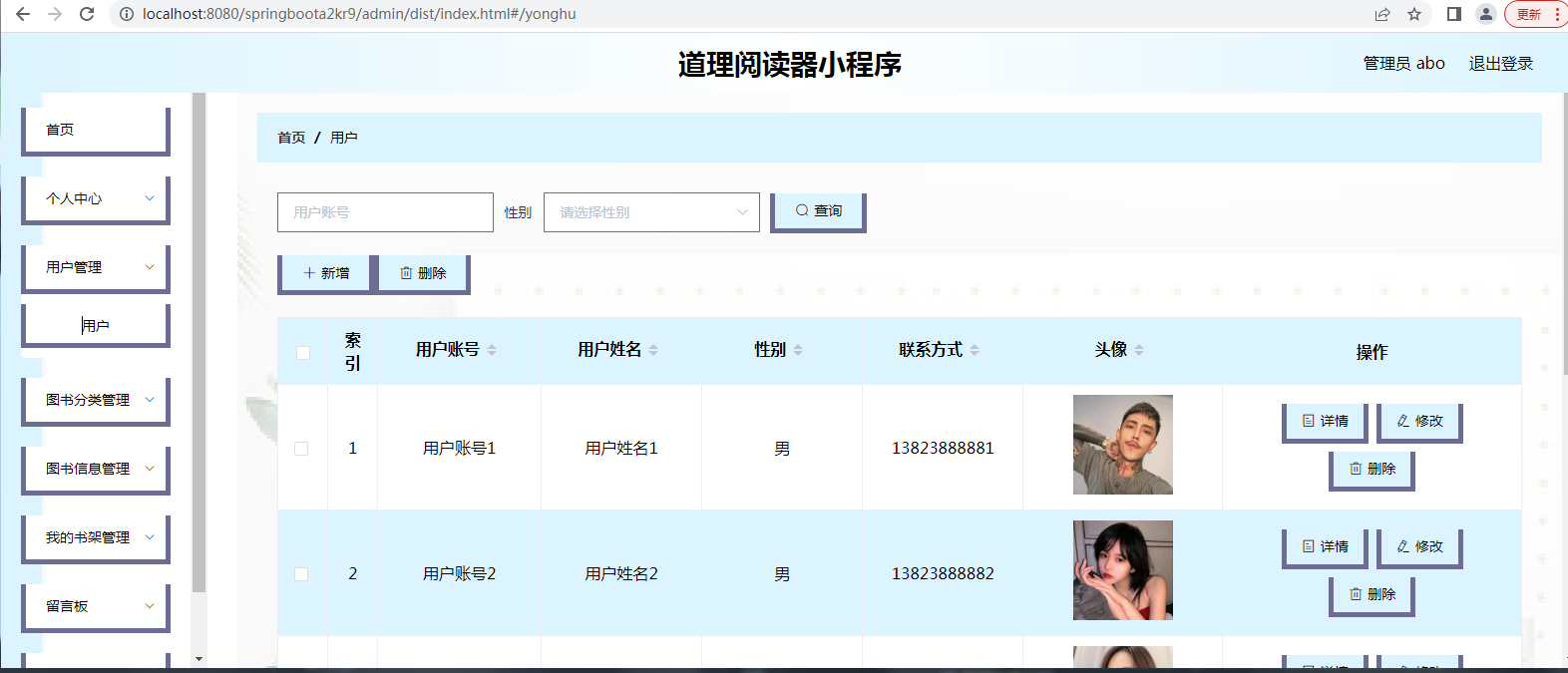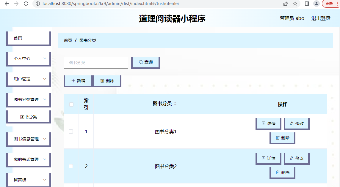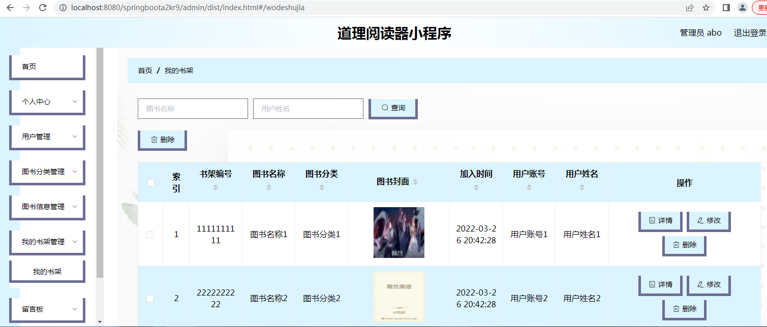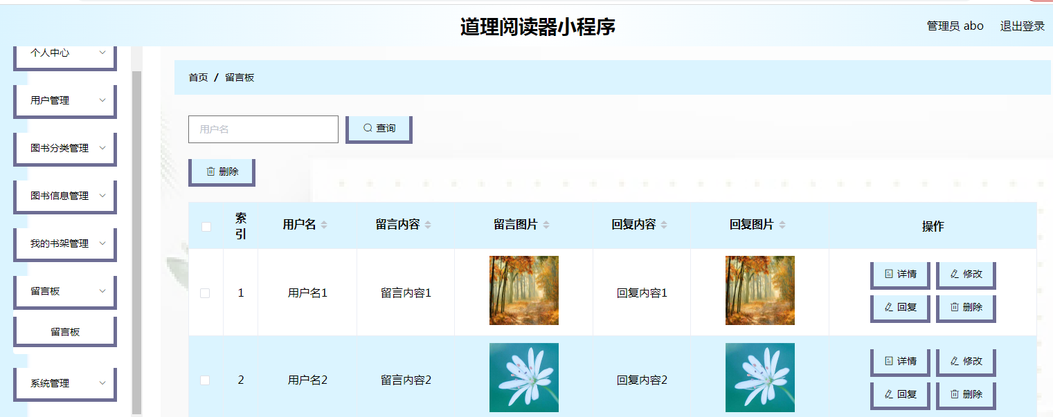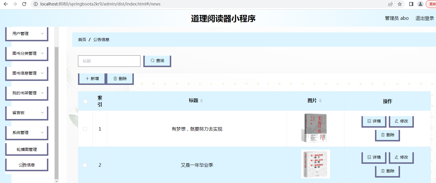管理员可以通过后台管理系统进行用户信息管理、图书分类管理、图书信息管理、书架管理、留言板管理、系统管理、轮播图管理以及公告信息管理等。管理员可以对用户进行管理,新增、编辑或删除图书分类、图书信息、轮播图以及公告信息等。管理员还可以管理留言板,查看和回复用户留言。