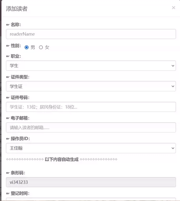 11. 添加读者:管理员可以添加新的读者账号,包括输入读者信息、分配读者账号等。