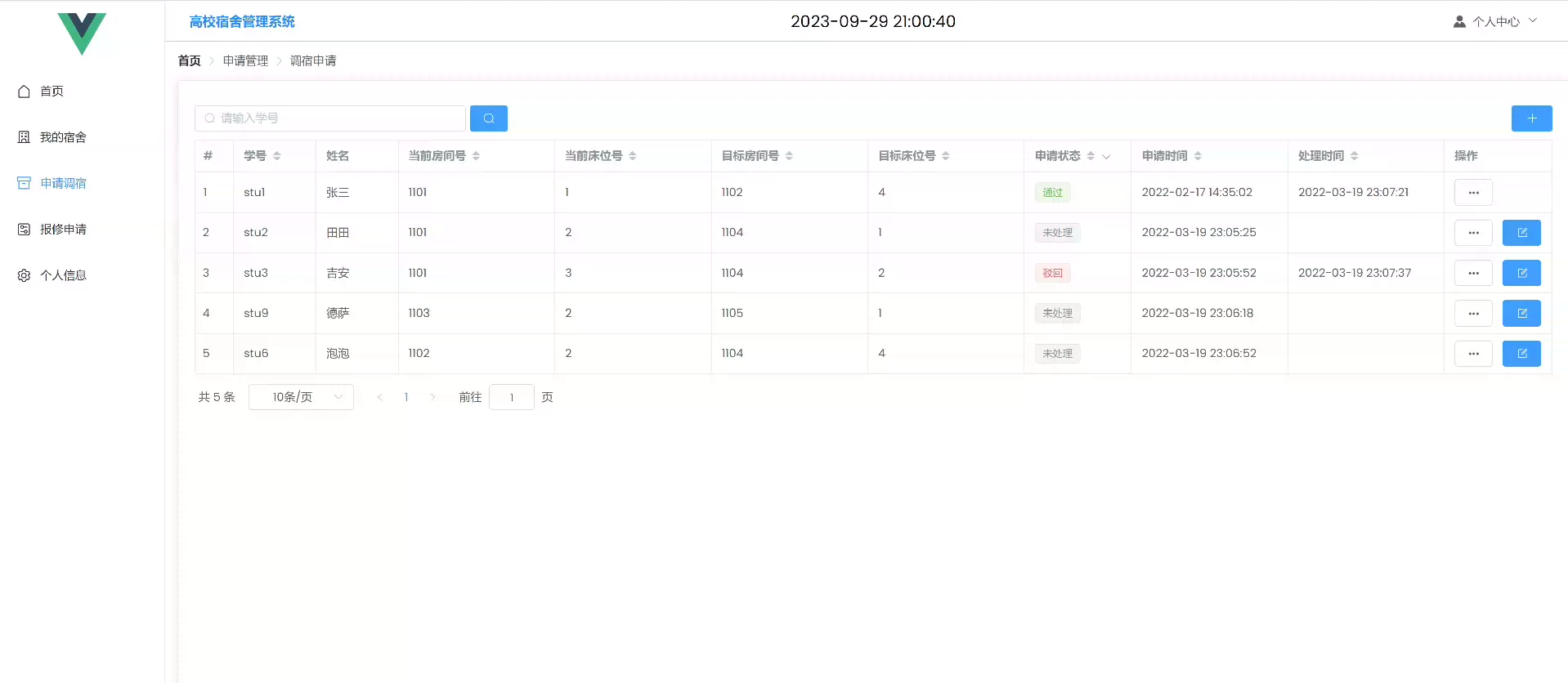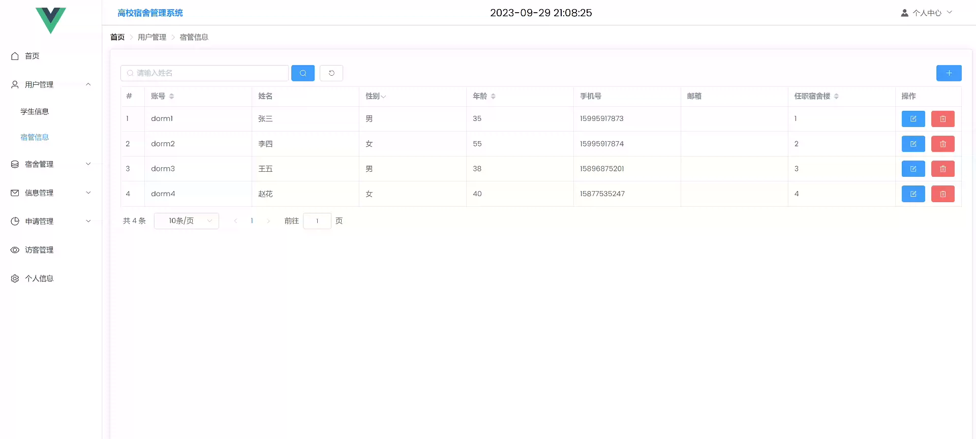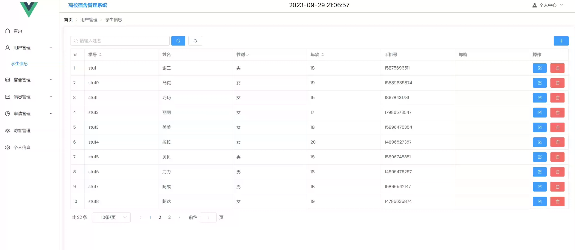 学生管理:宿舍管理员可以管理学生信息,包括添加、编辑、删除学生信息等操作。